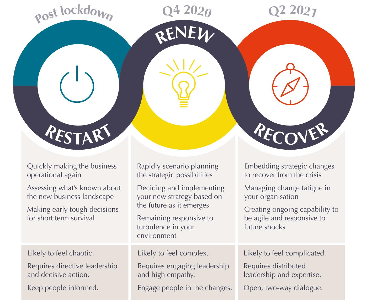 There will be a recovery. But even though we don't yet know when it will happen and what it will look like, (and we can assume it will happen at different times in different sectors) by the time it begins, the most successful organisations will be well prepared. How an individual business recovers will be a consequence of actions previously taken. So being successful in the recovery phase starts now, with what you spend your time doing in the restart and renew phases.